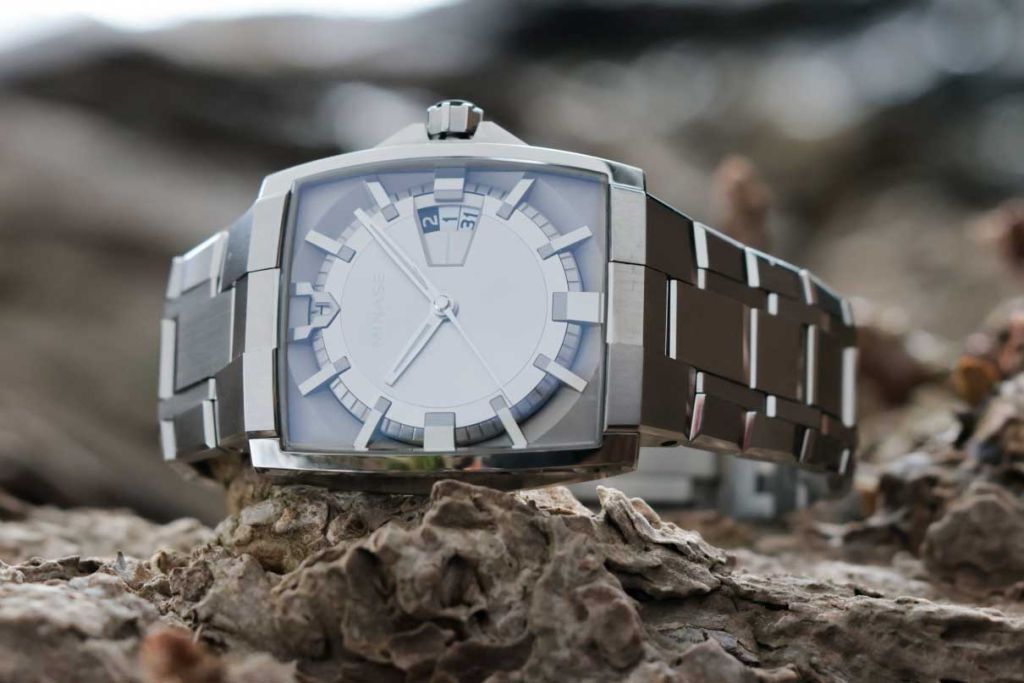 When the watch is viewed from either side, one notices that the fulcrums of the hour and minute hands are positioned higher than the four corners of the case.
