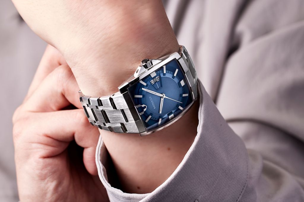 The case and lugs are also made of separate parts. The lugs combine parts having either a hairline or mirror finish, thereby achieving a brilliant appearance that no conventional single-case design watch can mimic. While more and more products are manufactured in uniform fashion using digital technology, MINASE leverages the full potential of humans’ delicate senses to achieve the level of beauty present in nature.