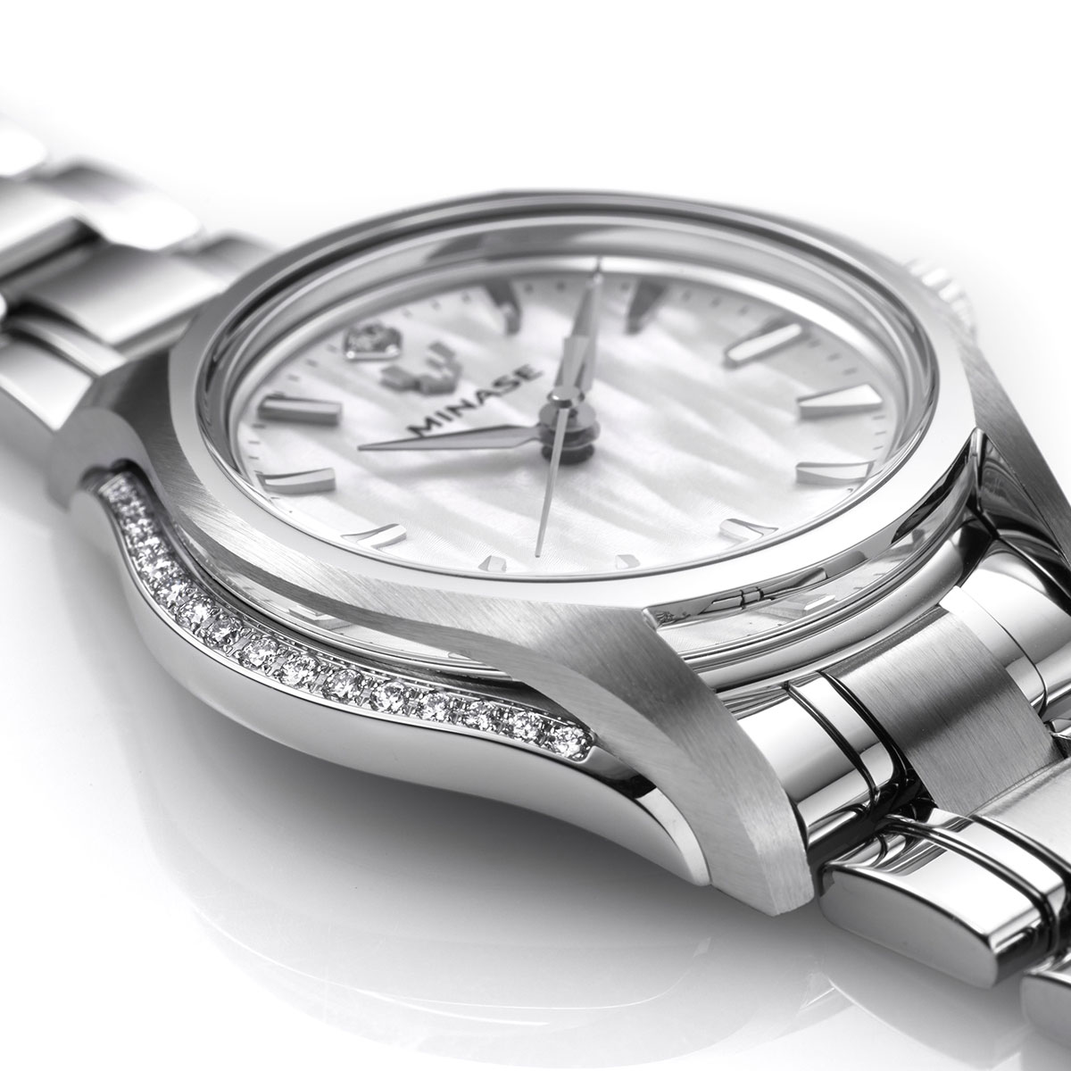 The dial pattern is inspired by how light randomly reflects off the surface of the Minase River, which glitters when viewed from any angle. The watch can be worn for special occasions as well as everyday use.