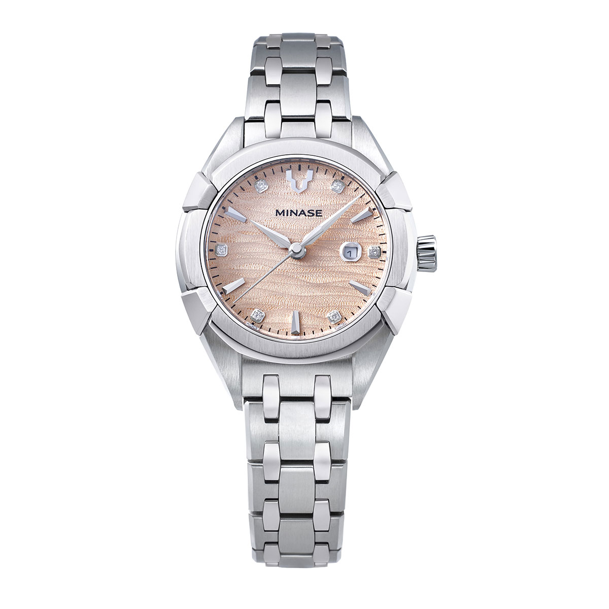 The horizontal gradation pattern on the dial is inspired by the glittering, languid waters of the Minase River, conveying an elegant, subtle and mature classiness.