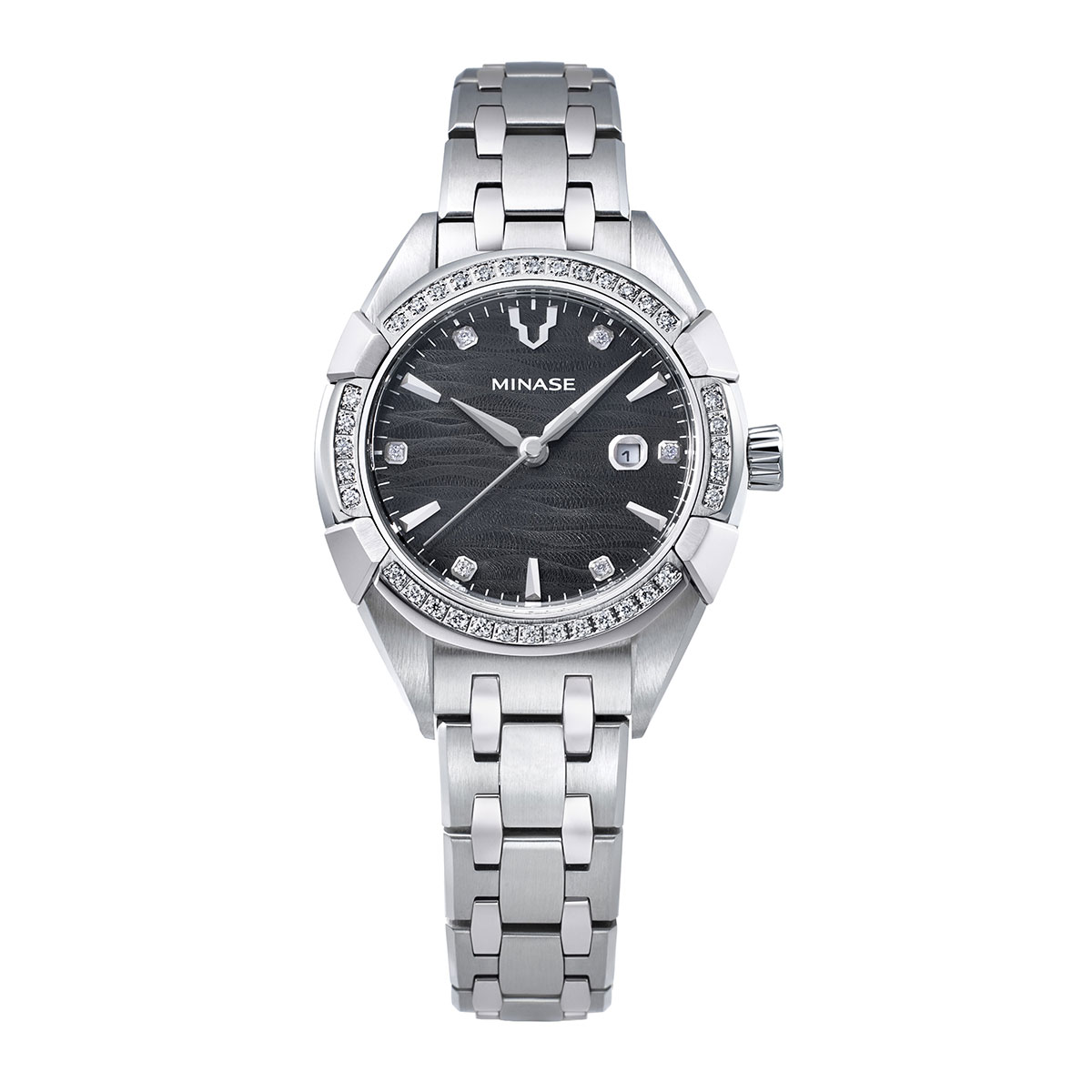 The horizontal gradation pattern on the dial is inspired by the glittering, languid waters of the Minase River, conveying an elegant, subtle and mature classiness.