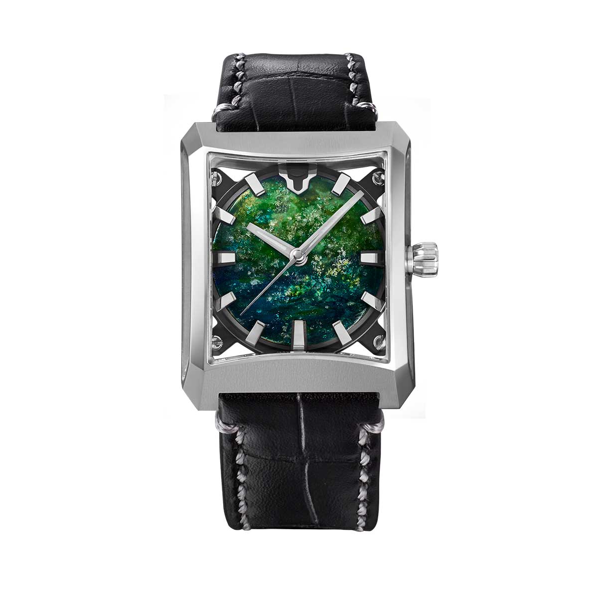 The pictorial space, suffused with a luminous shade of blue-green, is designed to accompany the wearer in daily life, offering an experience at once graceful and mysterious—an enduring sense of tranquillity carried within the passage of time.