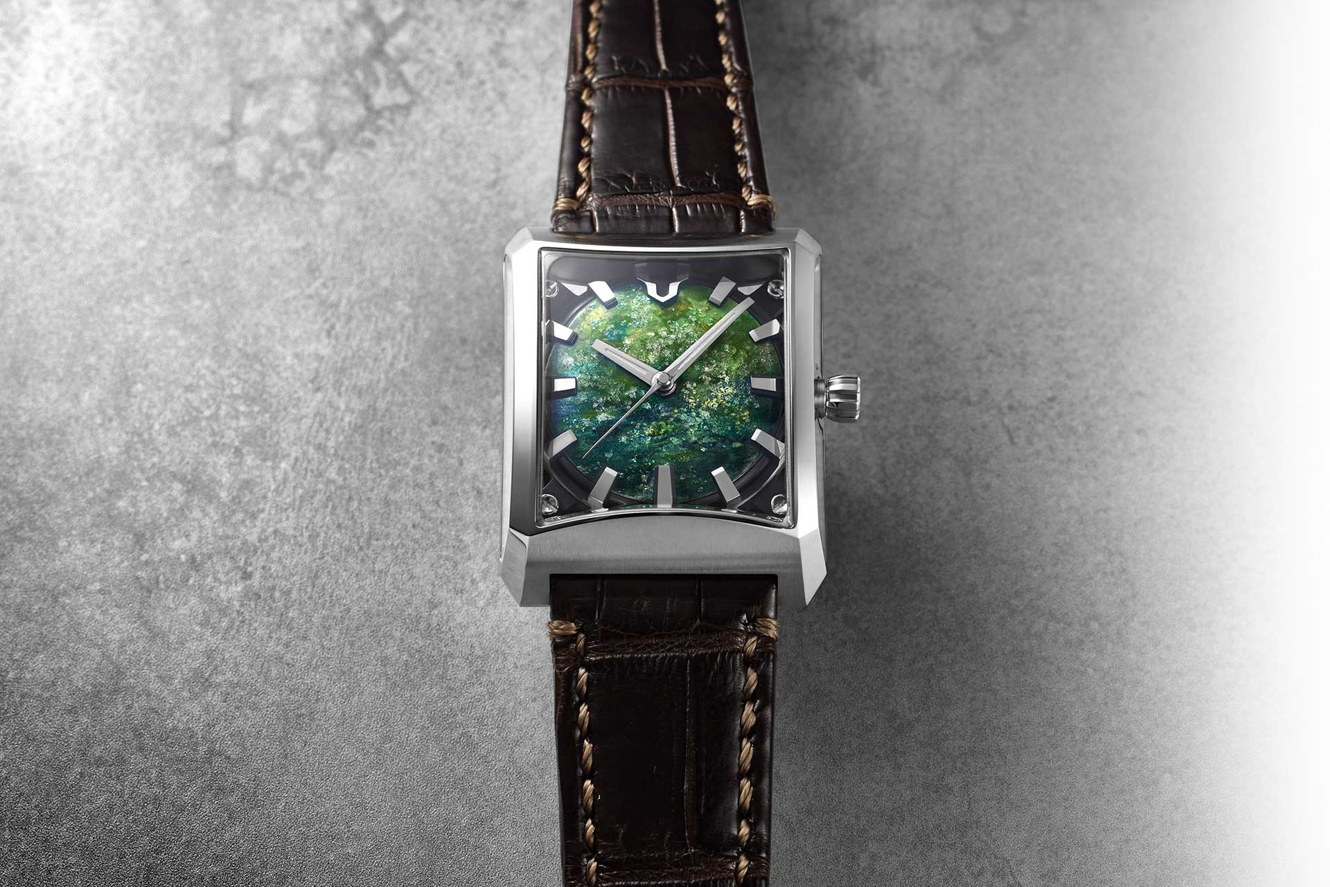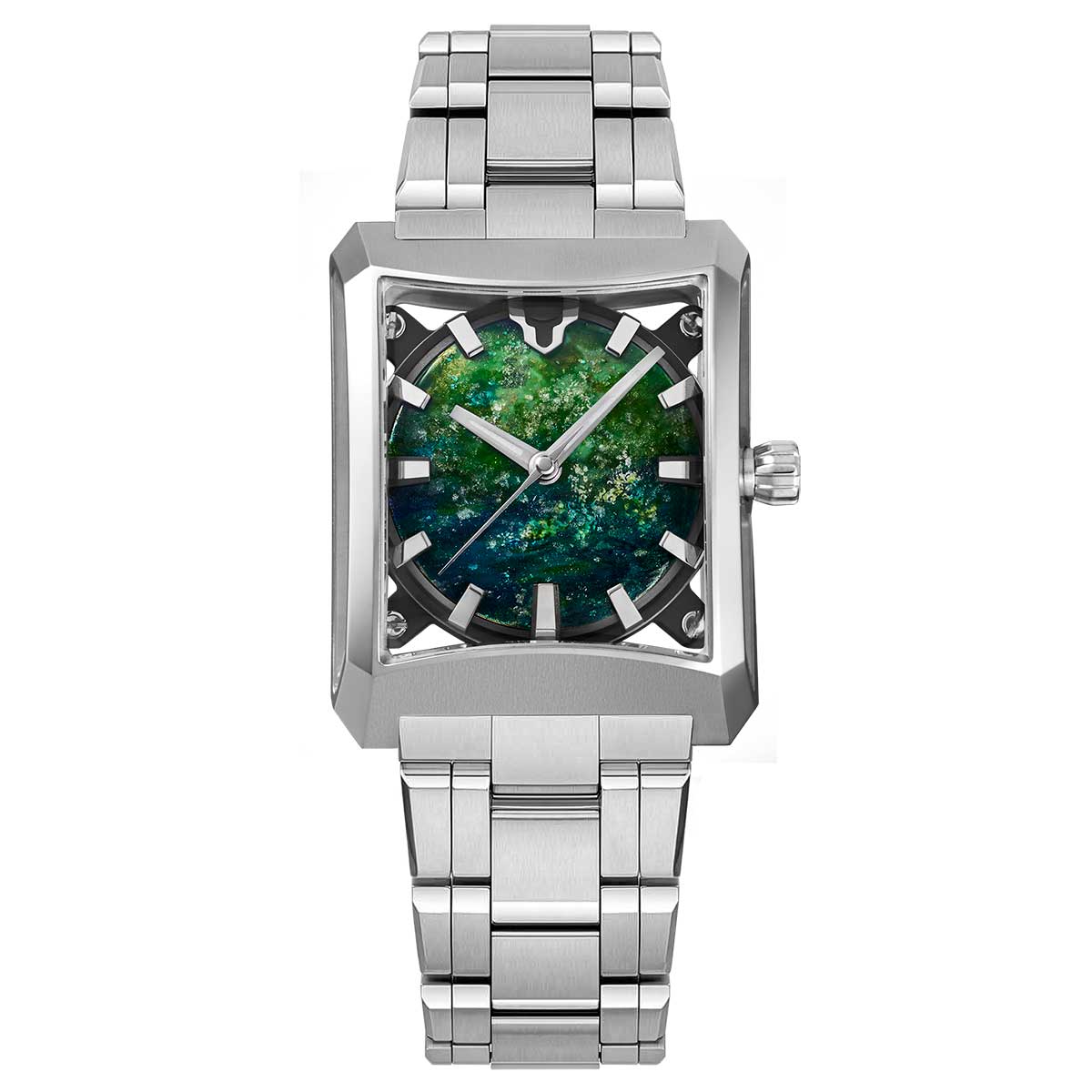The pictorial space, suffused with a luminous shade of blue-green, is designed to accompany the wearer in daily life, offering an experience at once graceful and mysterious—an enduring sense of tranquillity carried within the passage of time.
