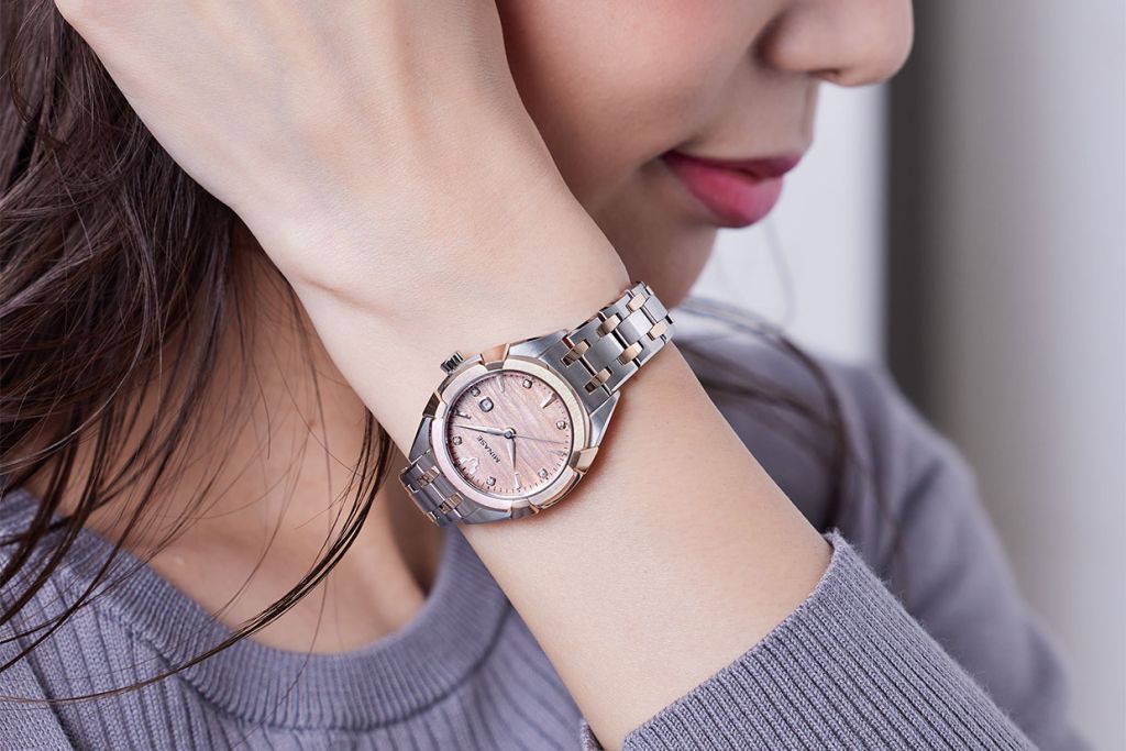 The horizontal gradation pattern on the dial is inspired by the glittering, languid waters of the Minase River, conveying an elegant, subtle and mature classiness.