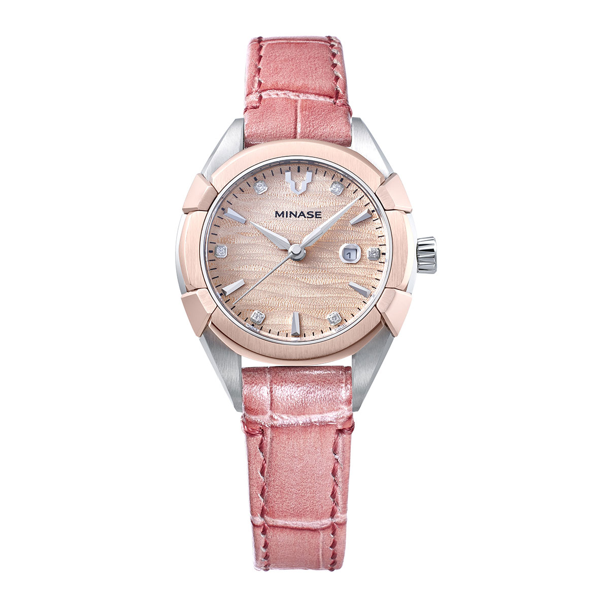 The horizontal gradation pattern on the dial is inspired by the glittering, languid waters of the Minase River, conveying an elegant, subtle and mature classiness.