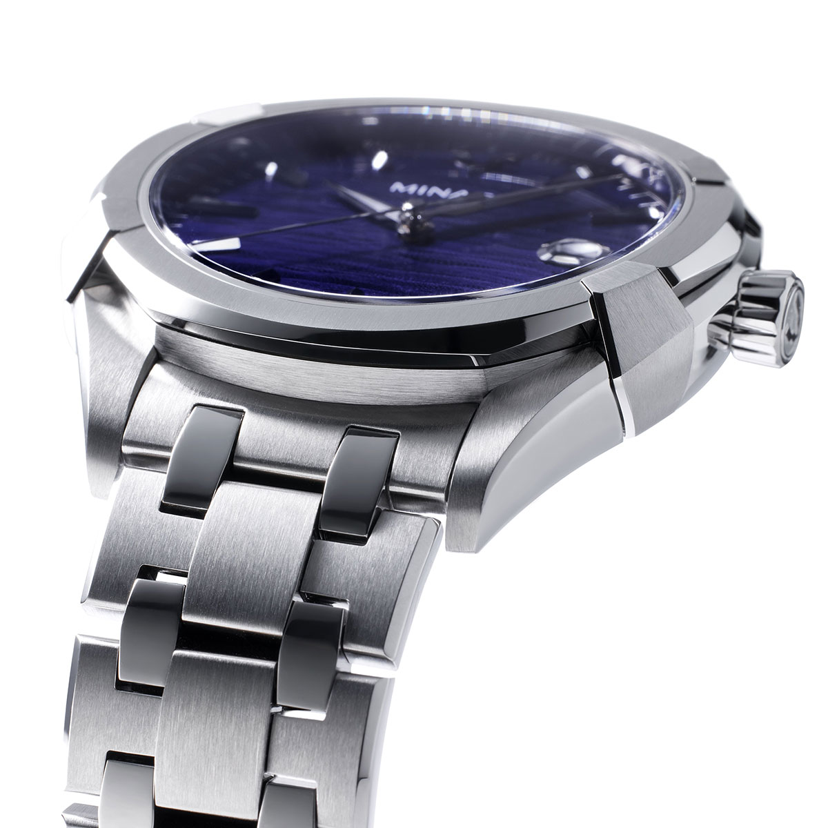 The horizontal gradation pattern on the dial is inspired by the glittering, languid waters of the Minase River, conveying an elegant, subtle and mature classiness.