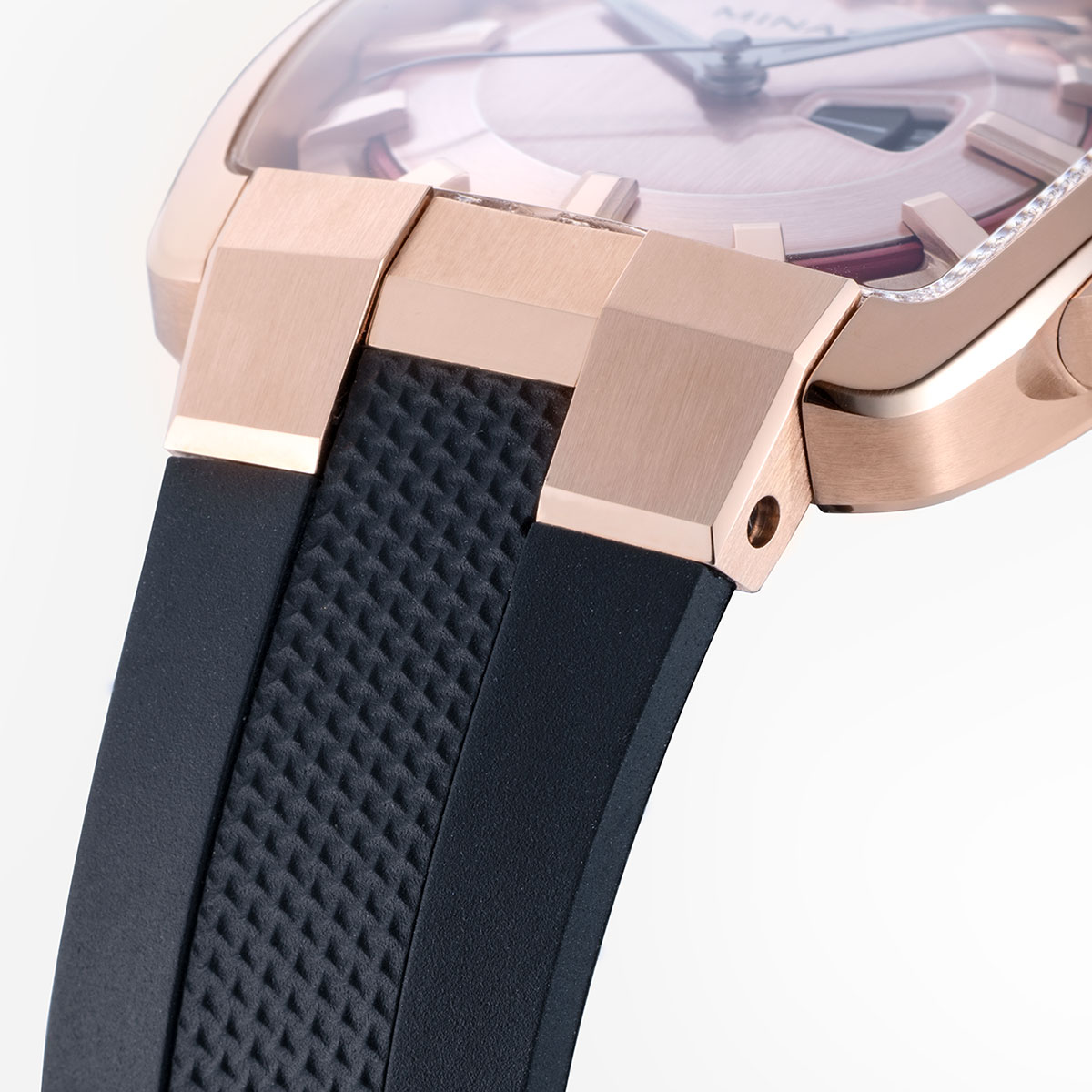 Thinner. More massive. Horizon, which is designed with the motif of an endless horizon, is characterized by its highly curved dome windshield formed by cutting and polishing the front and back sides of solid sapphire glass and the sense of tension like that of a water surface when viewed from the side. The hollow in the side of the case looks stately like a Japanese sword, representing subtle yet bold Japanese beauty in contrast with the satin-finished surface.